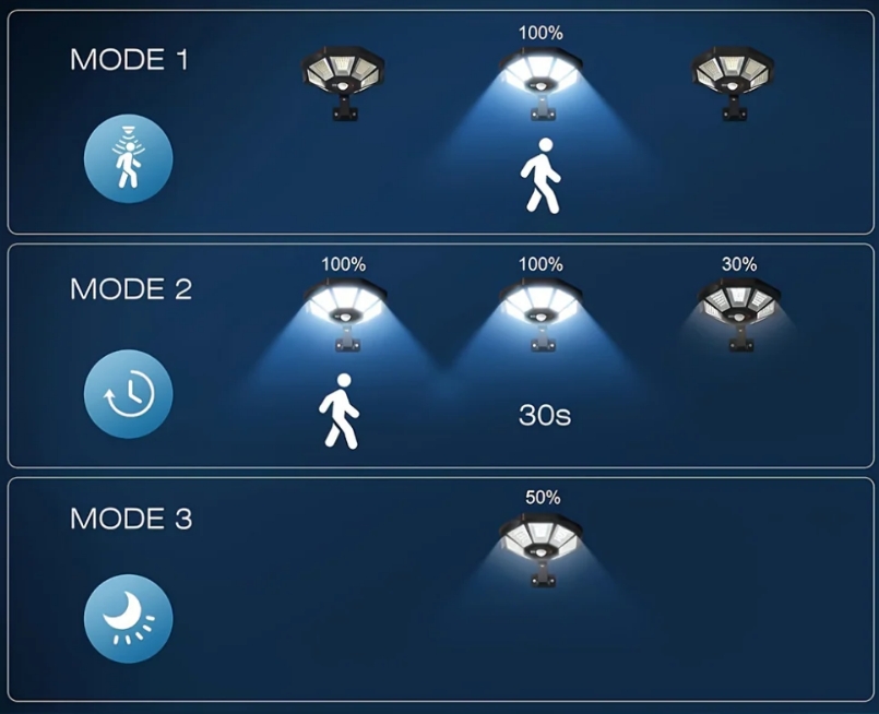 Három intelligens világítási mód közül lehet választani, így mindenki megtalálhatja a számára legmegfelelőbbet: a mozgásérzékelőnek köszönhetően a lámpa képes teljes fényerővel világítani, amikor mozgást érzékel, de beállítható úgy is, hogy mozgás után csökkentett fényerővel működjön tovább, vagy akár egész éjszaka folyamatos, visszafogott fényt biztosítson.