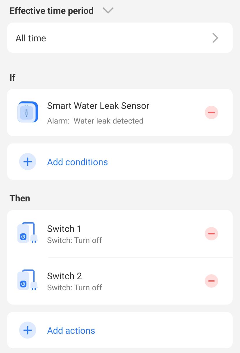A Meross eszközök, szenzorok képesek együttműködni egymással. Lehetőség van arra, hogy víz érzékelésére történjen valami – ebben a példában ha vizet érzékel, akkor kikapcsolja az elosztót.