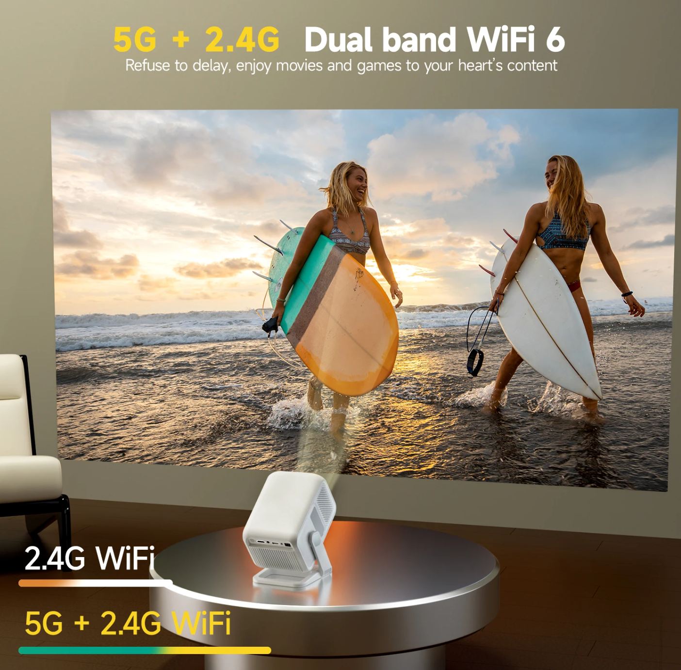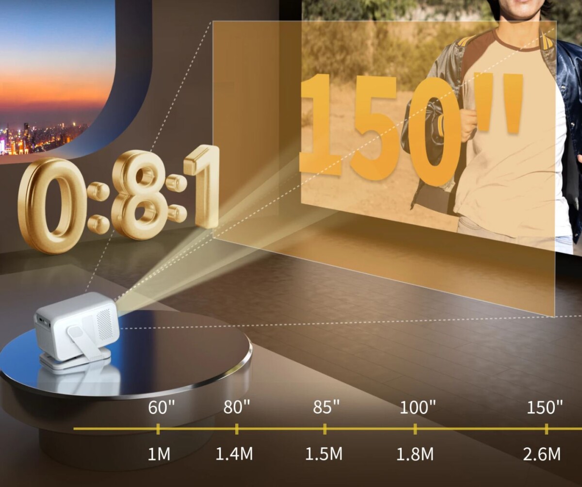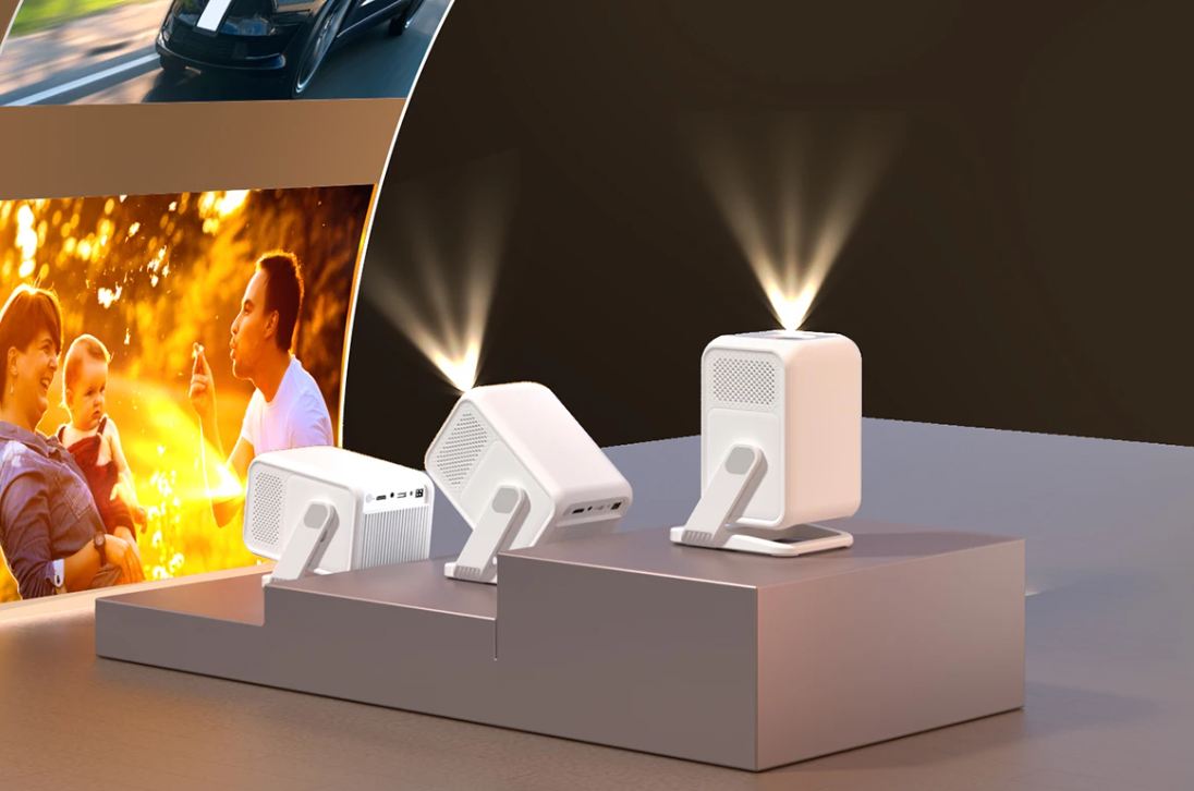 Egy egész kellemes dizájnnal rendelkező projektorról van szó, de a dizájnnál fontosabb, hogy gimbal projektor, ami azt jelenti, hogy van egy állványa, amivel tetszőleges szögben beállítható, így nem kell hozzá állvány, hogy megfelelő helyre vetítsen.