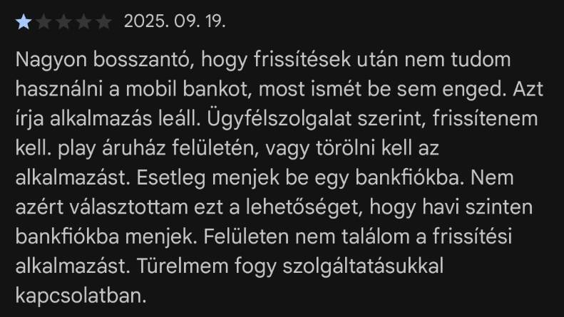 “Nagyon bosszantó, hogy frissítések után nem tudom használni a mobil bankot, most ismét be sem enged. Azt írja alkalmazás leáll. Ügyfélszolgálat szerint, frissítenem kell. play áruház felületén, vagy törölni kell az alkalmazást. Esetleg menjek be egy bankfiókba. Nem azért választottam ezt a lehetőséget, hogy havi szinten bankfiókba menjek. Felületen nem találom a frissítési alkalmazást. Türelmem fogy szolgáltatásukkal kapcsolatban.”