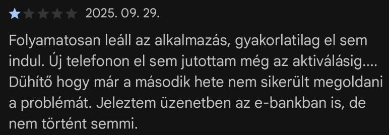 “Folyamatosan leáll az alkalmazás, gyakorlatilag el sem indul. Új telefonon el sem jutottam még az aktiválásig…. Dühítő hogy már a második hete nem sikerült megoldani a problémát. Jeleztem üzenetben az e-bankban is, de nem történt semmi.”