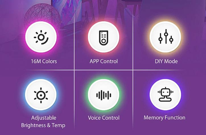 Mindent tud: fényerő, színhőmérséklet, RGB módok, éjszakai fény, időzítés, zene ritmusra villogás, memóriával az utolsó beállításokra.