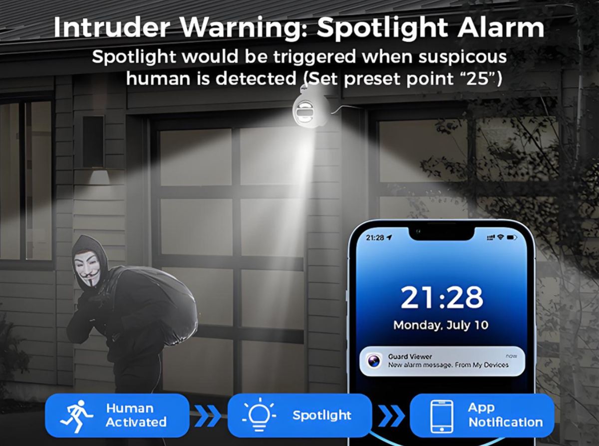 A reflektoros riasztás ha gyanús mozgást érzékel, a kamera megvilágítja a területet, ami egyrészt elrettentő lehet, másrészt javítja a láthatóságot is.