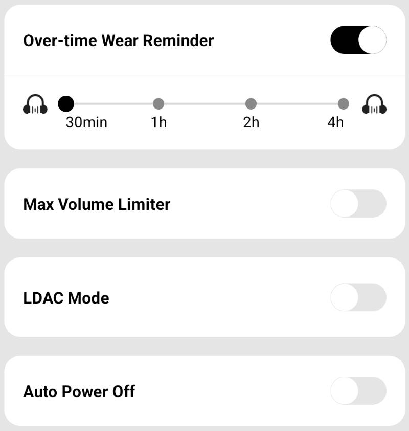 Lehetővé teszi, hogy értesítést kapjunk egy idő után, hogy tartsunk szünetet (max. 4 óra) és van automatikus kikapcsolás is (max. 1 óra), valamint limitálhatjuk is a maximális hangerőt.