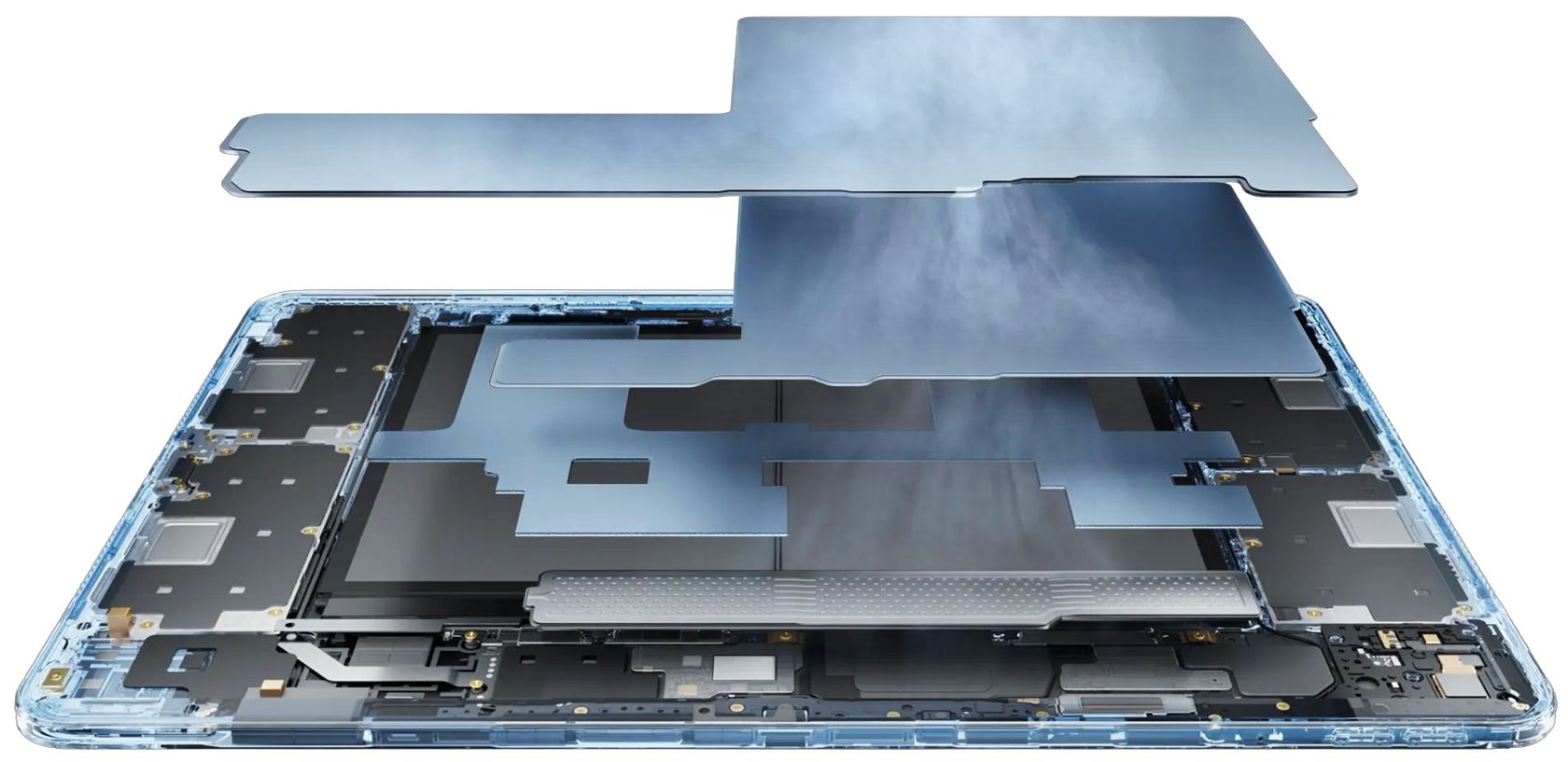 A OnePlus Pad 3 hűtési rendszere kategóriájában is kiemelkedő: a teljes hőleadó felület eléri a 34 857 mm²-t, amit egy fejlett grafit kompozit anyagokkal kombinált vapor chamber technológia egészít ki. Ez a megoldás 14%-kal hatékonyabb hőelvezetést biztosít az előző generációhoz képest, így intenzív játék vagy nagyobb rendszerterhelés mellett is hűvösebben és stabilabban működik a tablet.