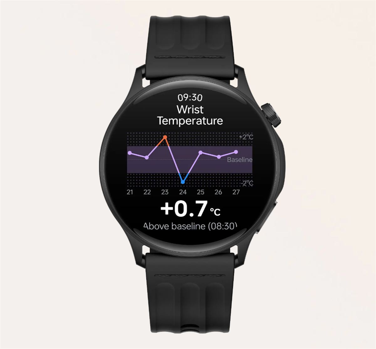 A csukló hőmérsékletének figyelése egy kiegészítő funkció, amely a testhő változásait követi, ami más mérésekkel együtt segít pontosabb képet alkotni a szervezet állapotáról, például fáradtság, vagy kezdődő megbetegedés esetén.
