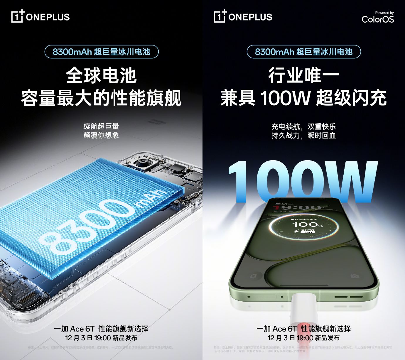 Az Ace 6T hatalmas, 8300mAh kapacitású akkumulátort kap, ami eddig a legnagyobb egy OnePlus telefonban és 100W-os gyorstöltést támogat.