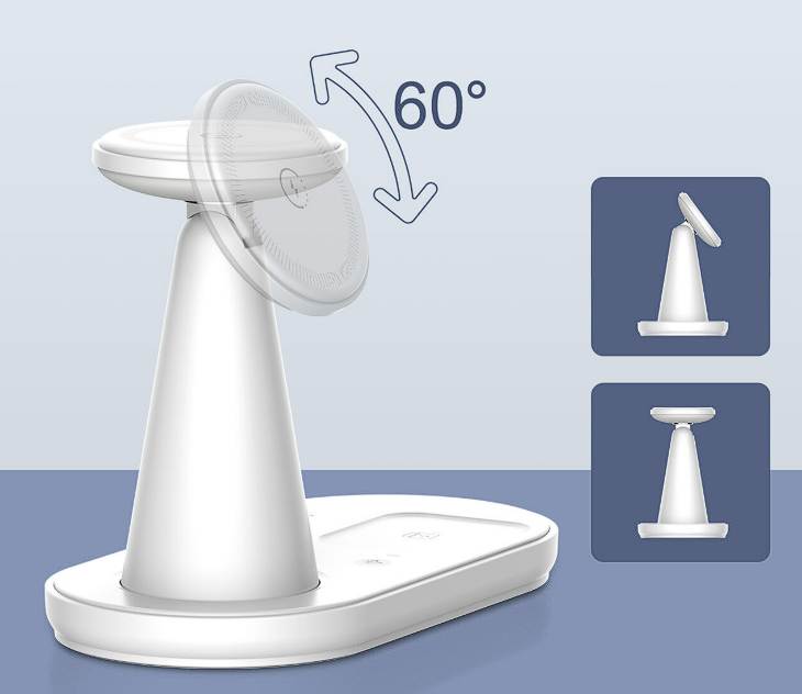 A szög 60 fokig állítható, így kényelmesen lehet videókat nézni vagy értesítéseket olvasni töltés közben. A mágneses rögzítés annyira stabil, hogy még akkor sem esik le a telefon, ha véletlenül meglökődik az asztal.