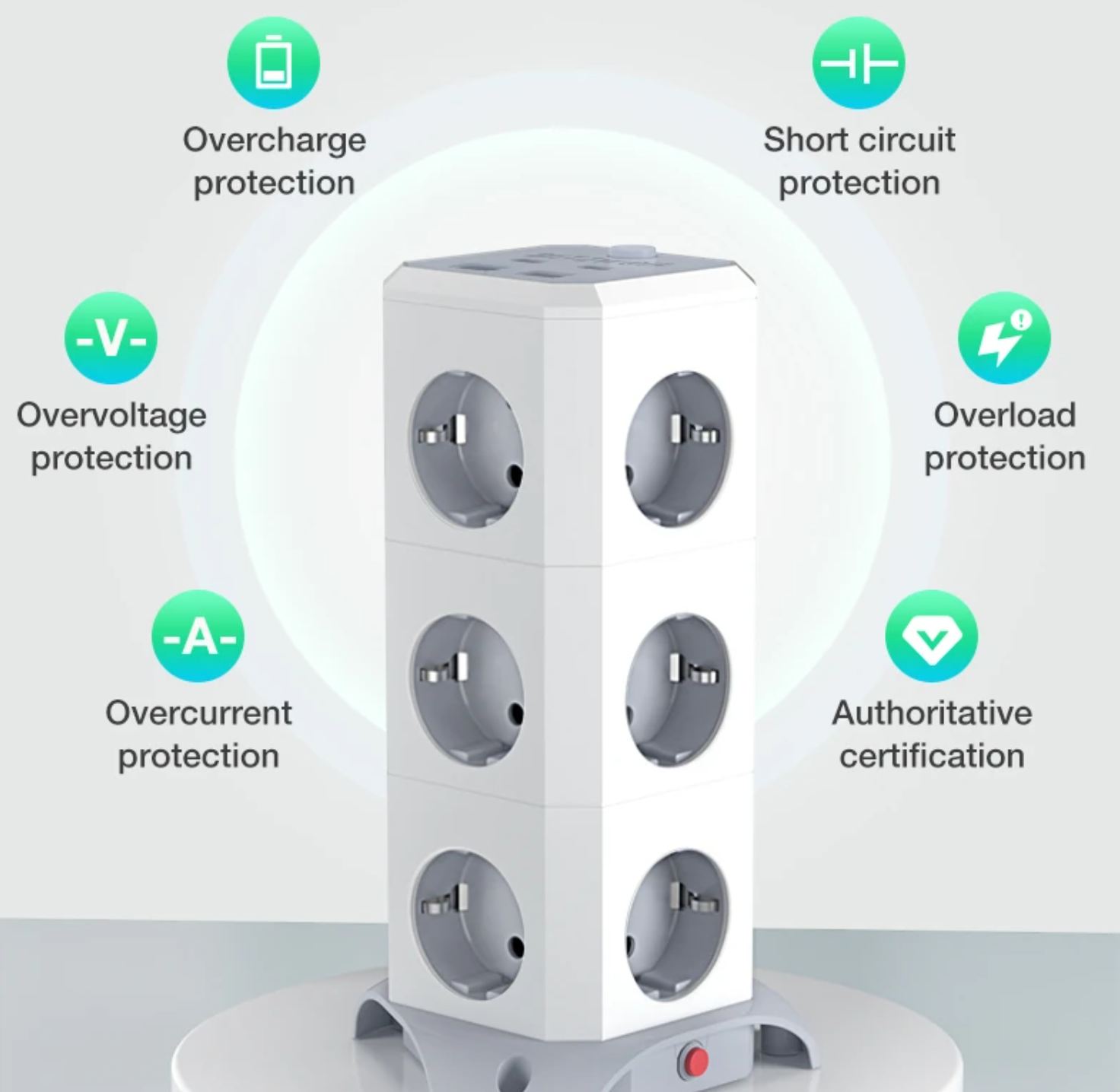 Túlfeszültség-védelem óvja az eszközöket a hirtelen áramingadozásoktól és túláram elleni védelemmel is felszerelték, amely akkor lép működésbe, ha egy-egy port túl sok áramot venne fel.
