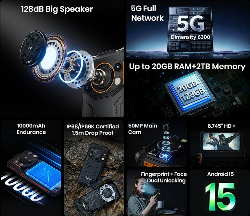 A FOSSiBOT F110 Pro egy masszívan burkolt, jól védett telefon, amit arra terveztek, hogy ellenálljon a legkeményebb körülményeknek is. Vízálló IP68, IP69K szinten, valamint por és ütésálló, így nem kell aggódnod miatta sem a munkahelyeden, sem egy túra során.