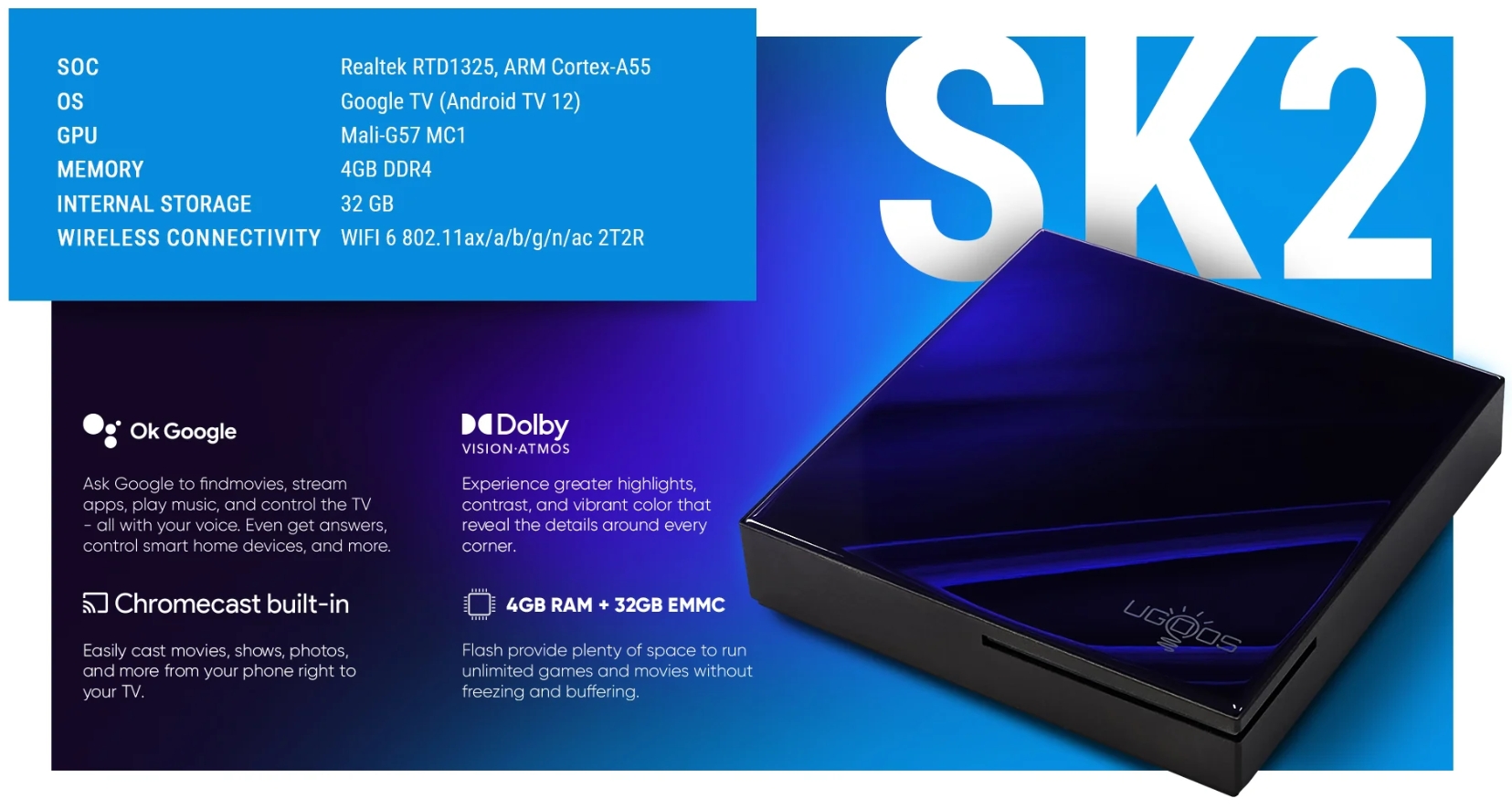 A Ugoos SK2 egy prémium 4K TV okosító erős hardverrel, Dolby Digital Plus, Dolby Atmos és Vision támogatással, wifi 6-tal és vezetékes internettel.