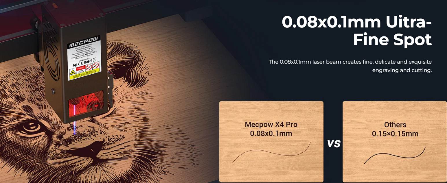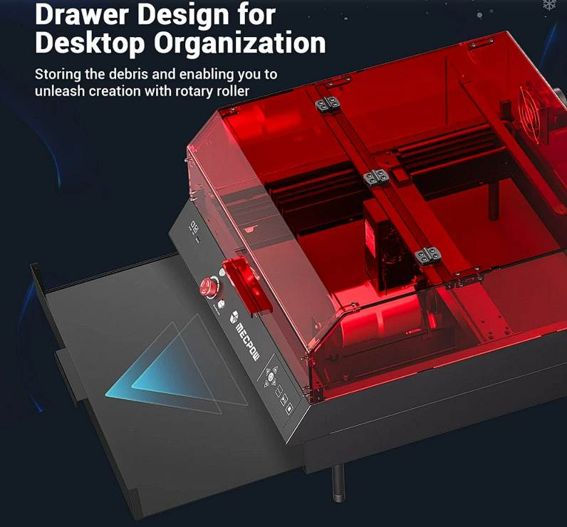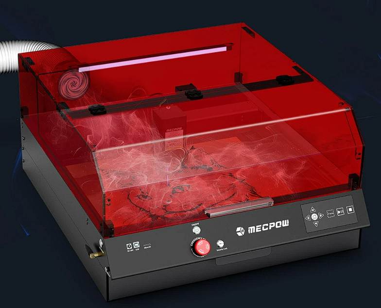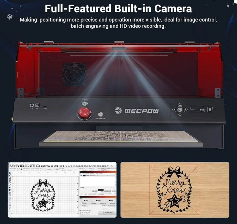 A Mecpow X4 Pro egyik legnagyobb előnye a teljesen zárt, professzionális felépítés, ami sokkal biztonságosabbá teszi a használatot. A beépített kamera élő képet ad a munkadarabról, így a pozicionálás gyerekjáték.
