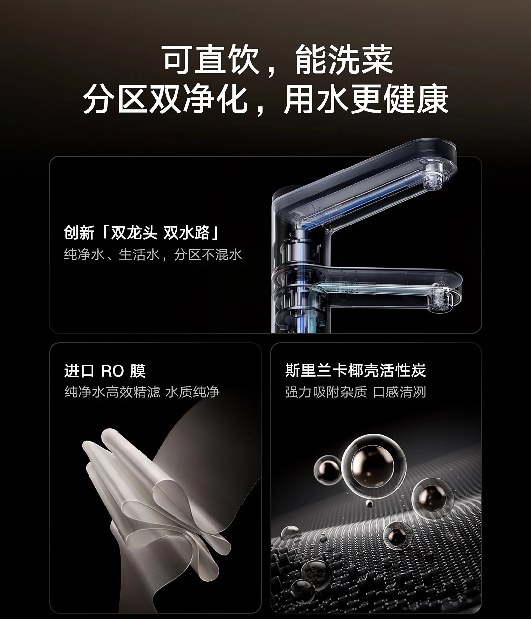 Mindkét víztisztító a Xiaomi új „Dual Faucet, Dual Waterway” kialakítását alkalmazza, amely a ivóvizet és a háztartási vizet két teljesen különálló csővezetékre osztja. Ez azt jelenti, hogy nem kell többé kompromisszumot kötni a kiváló minőségű ivóvíz és a szűrt háztartási víz (például zöldségek vagy rizs mosására használt víz) között.