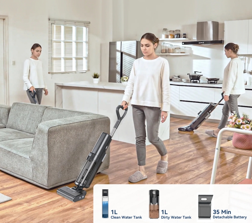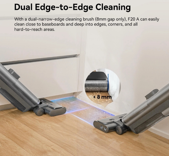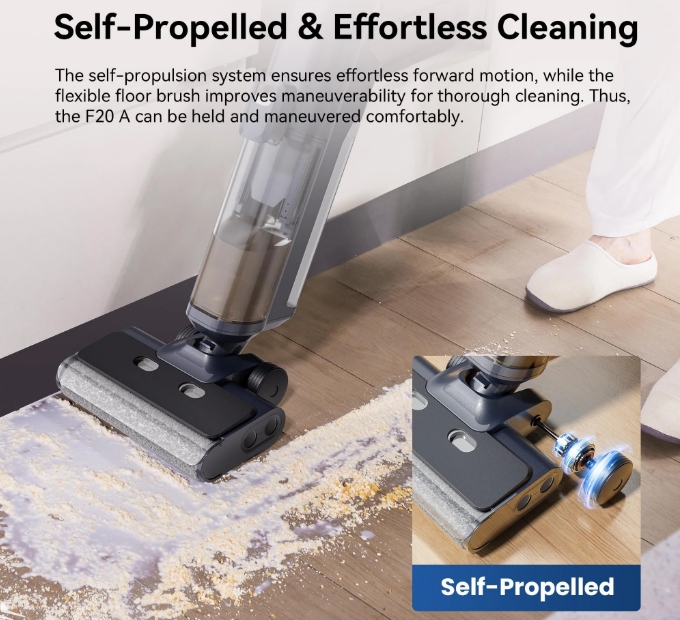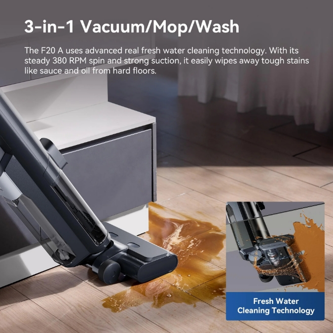 A Proscenic F20A három az egyben: egyszerre porszívóz, felmos, és nedvesen tisztít. A “True Fresh Water Cleaning” technológiának köszönhetően mindig tiszta vízzel dolgozik, így a padló nem lesz csíkos vagy maszatos. A 380-as fordulatszámú hengerkefe még a makacs szennyeződéseket is könnyedén eltávolítja, legyen szó kiömlött kávéról, sárfoltról vagy épp a reggeli morzsákról.