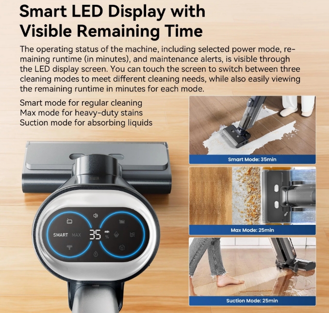 Az okos LED kijelzőn minden fontos információt látsz: hátralévő idő, aktuális üzemmód, karbantartási figyelmeztetések. A három tisztítási mód között egyetlen érintéssel válthatsz, a készülék pedig ötnyelvű hangutasításokkal segít, ha elakadnál.