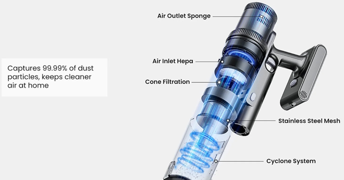 - Szűrőrendszer: 5 fokozatú (ciklonos rendszer, rozsdamentes acél szita, kúpos szűrő, HEPA szűrő, kimeneti szivacs)