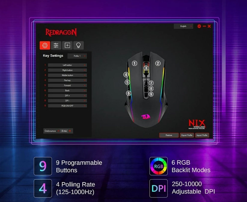 A Redragon M914-RGB első ránézésre is egész különleges. Az RGB világítás tényleg látványos, és kilencféle effekt közül választhatsz, valamint a fényerő és a sebesség is állítható. Az egér formája kézre áll, a görgő pedig csúszásmentes, így nem kell attól tartanod, hogy egy fontos pillanatban elcsúszik az irányítás.