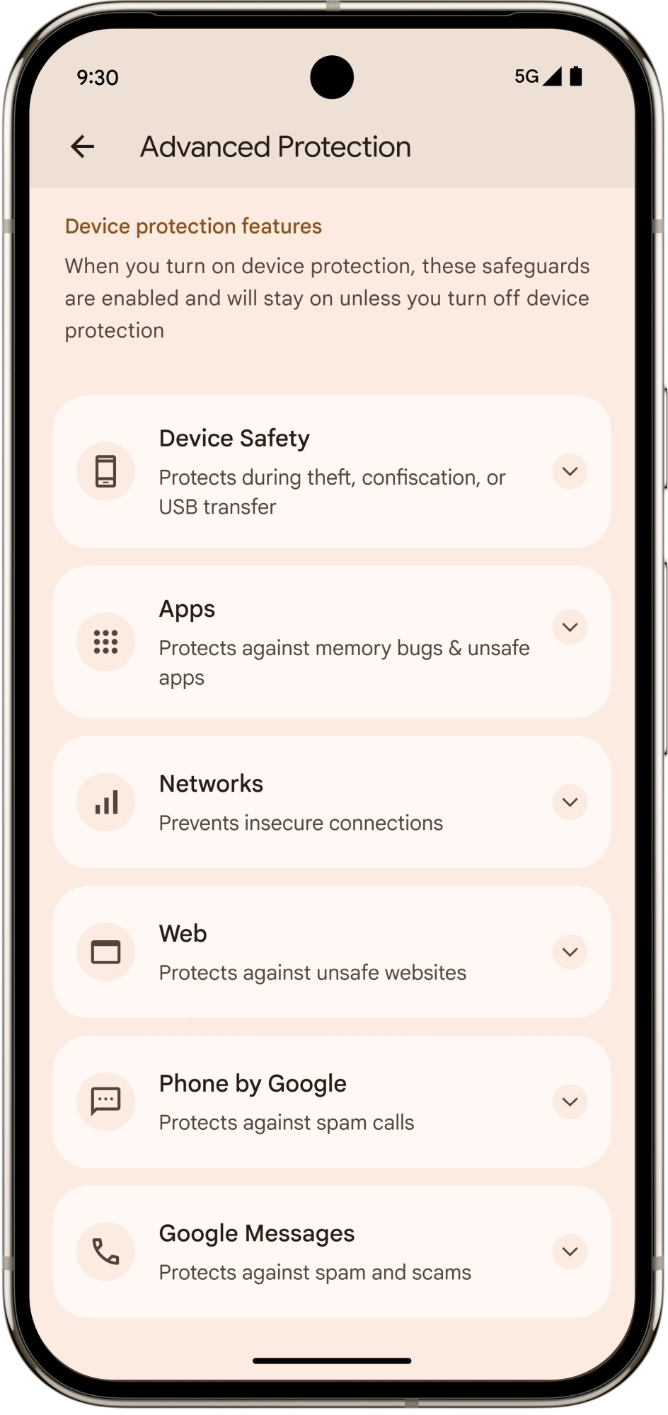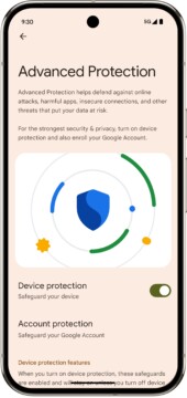 Az Advanced Protection egy biztonsági mód és egy API (alkalmazásprogramozási felület). Biztonsági módként gondoskodik arról, hogy az Android legfejlettebb biztonsági funkciói egyszerre legyenek aktívak és összehangoltan működjenek a kiberfenyegetések, kártékony alkalmazások és adatvesztési kockázatok elleni védelem érdekében. Az új és már meglévő, biztonsági összehasonlításokon kiválóan teljesítő funkciók egyesítésével átfogó védelmet biztosít több kritikus területen.