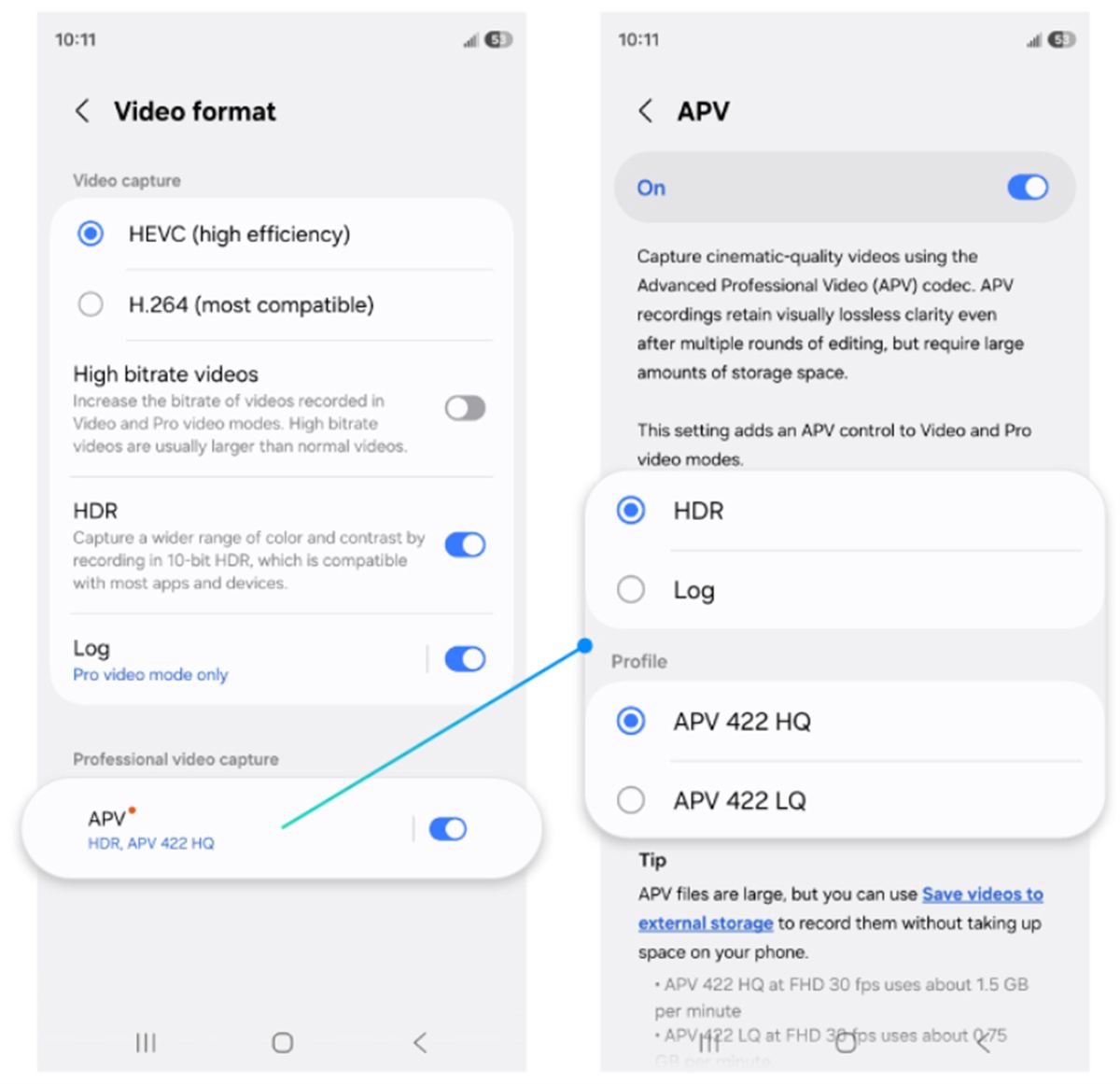 A tartalomkészítők számára fejlettebb eszközök is elérhetők, köztük az Advanced Professional Video (APV) kodek támogatása, amelyet a Samsung először 2023-ban jelentett be. Ez egy vizuálisan veszteségmentes videokodek, amelyet professzionális szintű videórögzítéshez és utómunkához fejlesztettek. A Samsung szerint az APV filmszerű minőséget kínál, miközben a fájlméret közel 20%-kal kisebb lehet a gyakran használt kodekekhez, például a HEVC-hez képest.