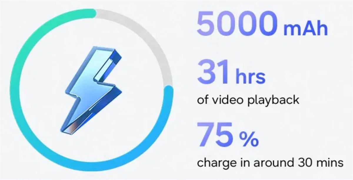 Az akkumulátor kapacitása 5000 mAh, amely akár 31 óra videólejátszást biztosít, és Super Fast Charging 3.0 segítségével 30 perc alatt 75%-os töltöttség érhető el. Támogatott a legfeljebb 25 W-os vezeték nélküli töltés kompatibilis Qi 2.2 töltőkkel, valamint a 4.5 W-os fordított vezeték nélküli töltés is.