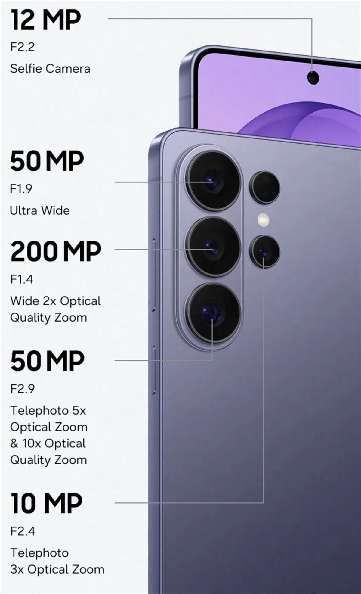 Fotózás terén a Samsung eddigi legfejlettebb kamerarendszere került bele, amelynek központi eleme egy 200 MP-es főkamera, mellette egy 50 MP-es ultraszéles látószögű szenzor, egy 10 MP-es telefotó kamera 3x zoommal, valamint egy 50 MP-es periszkópos kamera 5x optikai zoommal és 100x AI-alapú Space Zoom támogatással.