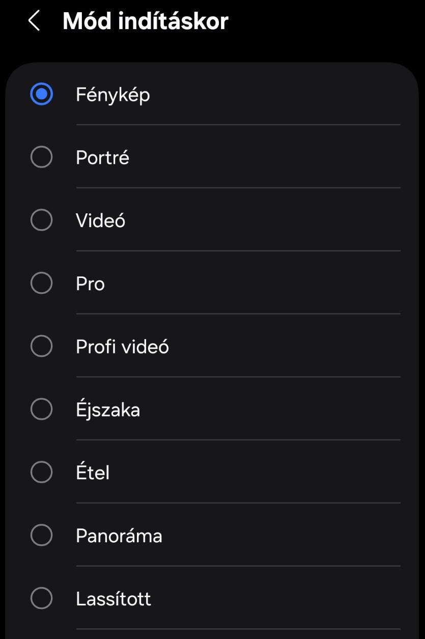 Itt ami a legfontosabb az a “Mód indításakor” beállítás, amellyel megadhatjuk, hogy ha a kamera betölt, akkor melyik módot indítsa el, aminek nagy előnye, hogy nem kell mindig előásni, vagy váltogatni a módok között.