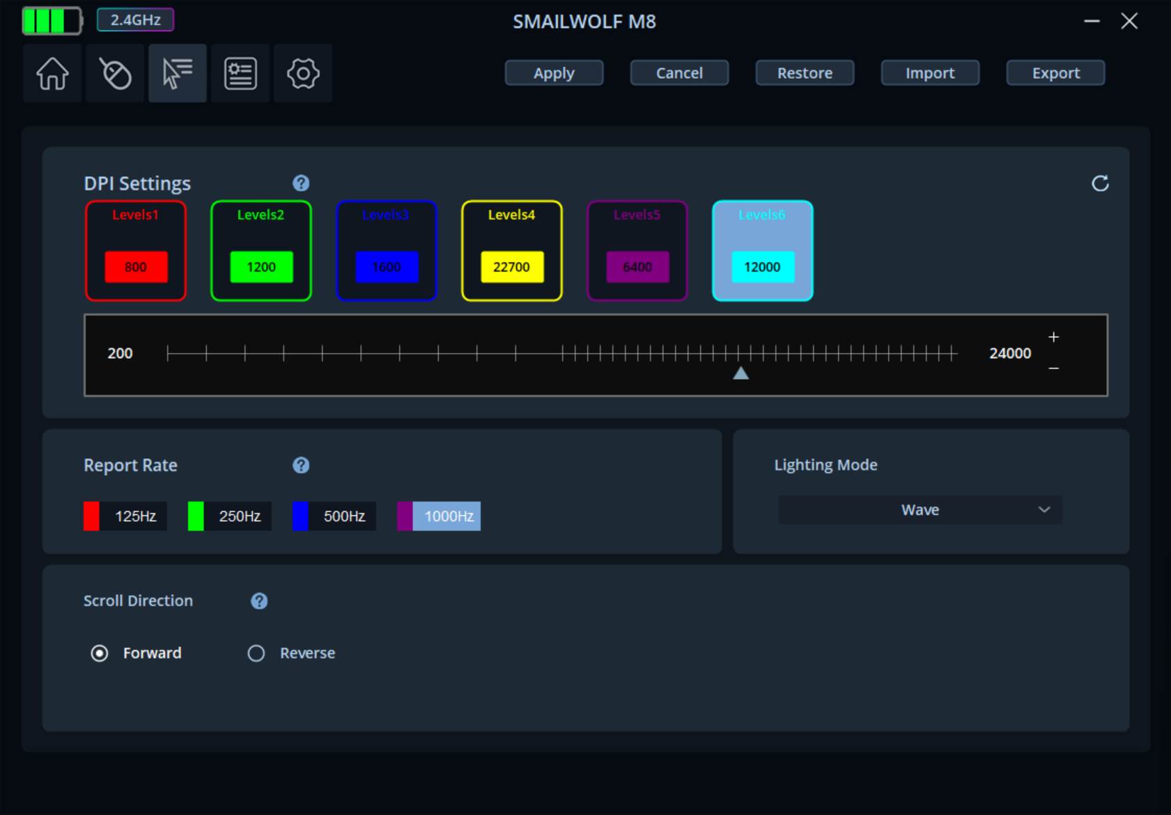 DPI tartomány: állítható 800/1200/1600/3200/6400/12000 DPI
