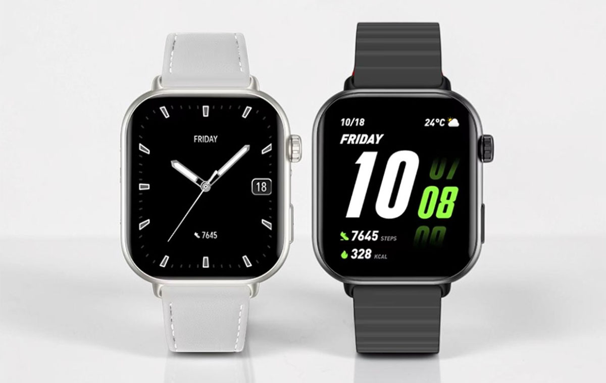 Apple Watch stílusú, négyszög alakú okosóra 1.85″ méretű AMOLED kijelzővel és két gombbal. A felső forgatható, aminek van funkciója, a menüben is lehet vele járkálni. Az alsó funkciója viszont szabadon beállítható, ami nagyon hasznos tud lenni.