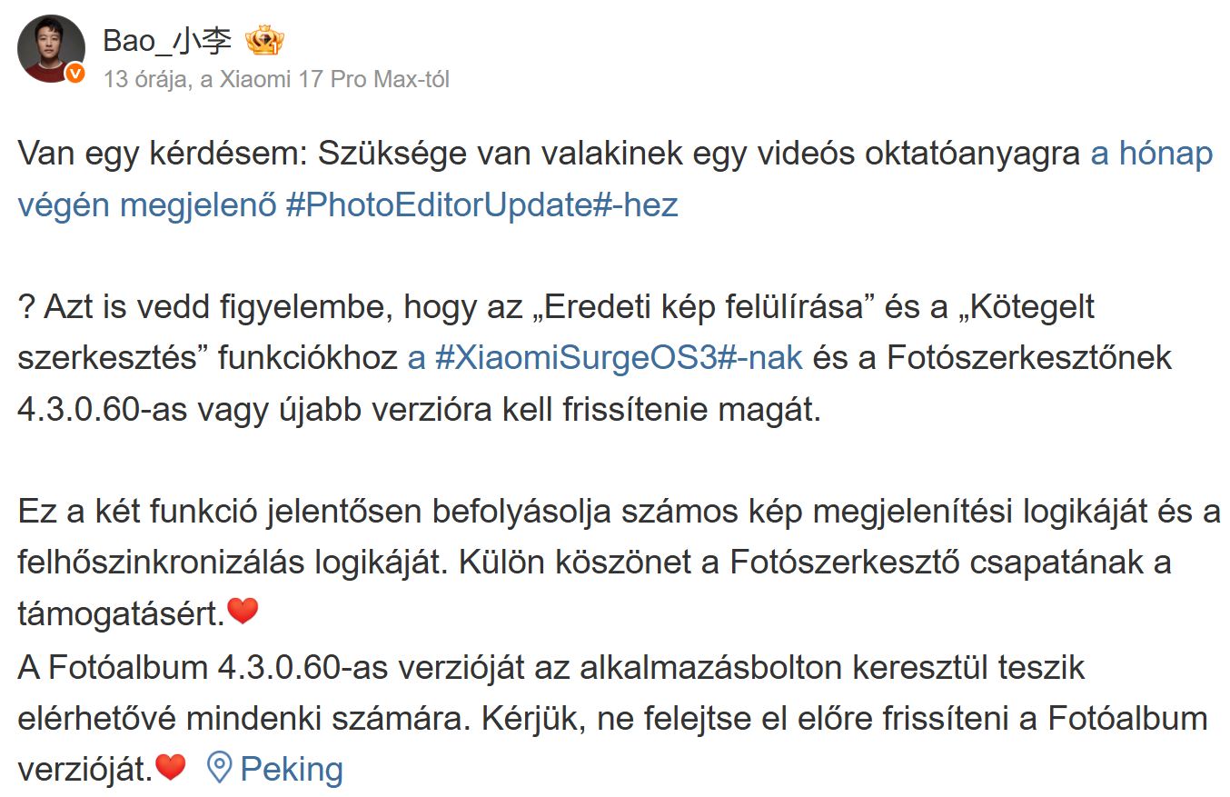 A Xiaomi kamerarészlegének termékmenedzsere, Bao Xiaoli által kiadott vállalati közlemény szerint a frissítés várhatóan még a hónap vége előtt megérkezik, és rugalmasabb, produktívabb fotószerkesztési élményt kínál majd a támogatott Xiaomi modellek tulajdonosainak.