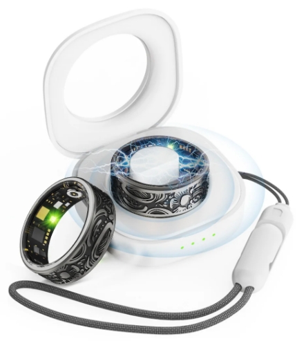 A gyűrű 3–5 napos aktív használatot tesz lehetővé egy feltöltéssel, készenléti üzemmódban pedig akár 7–10 napig is működőképes. A mágneses töltés gyors, 1–2 órát vesz igénybe.