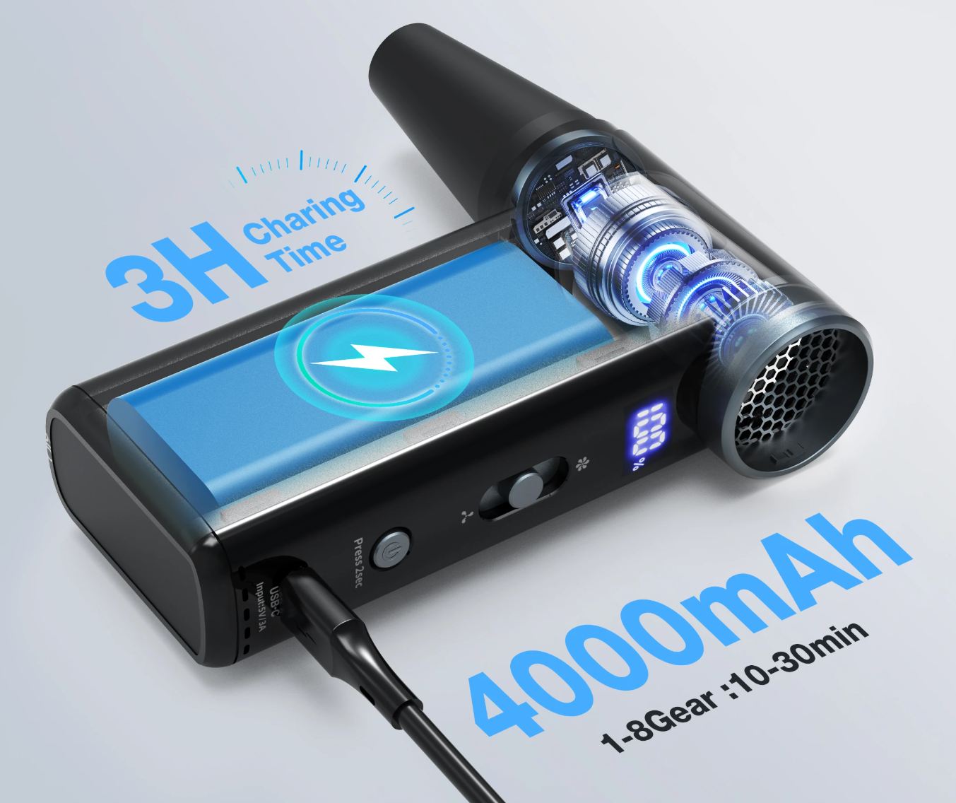 A légáramlat ereje több fokozatban állítható, ami a gyakorlatban azt jelenti, hogy lehet finoman is fújni egy például billentyűzetet vagy kamerát, de ha kell, akkor komolyabb erővel ki lehet hajtani a port egy számítógépházból vagy autó szellőzőrácsból.