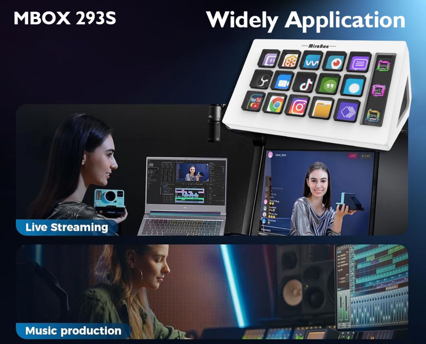 A MiraBox 293s egy olyan számítógépes irányító központ és stream deck, amelynek 15 gombja van és mindegyikre egyedi funkció állítható és mindnek saját kijelzője van. Az Elgato stream deckekre egy sokkal olcsóbb alternatívát jelent.