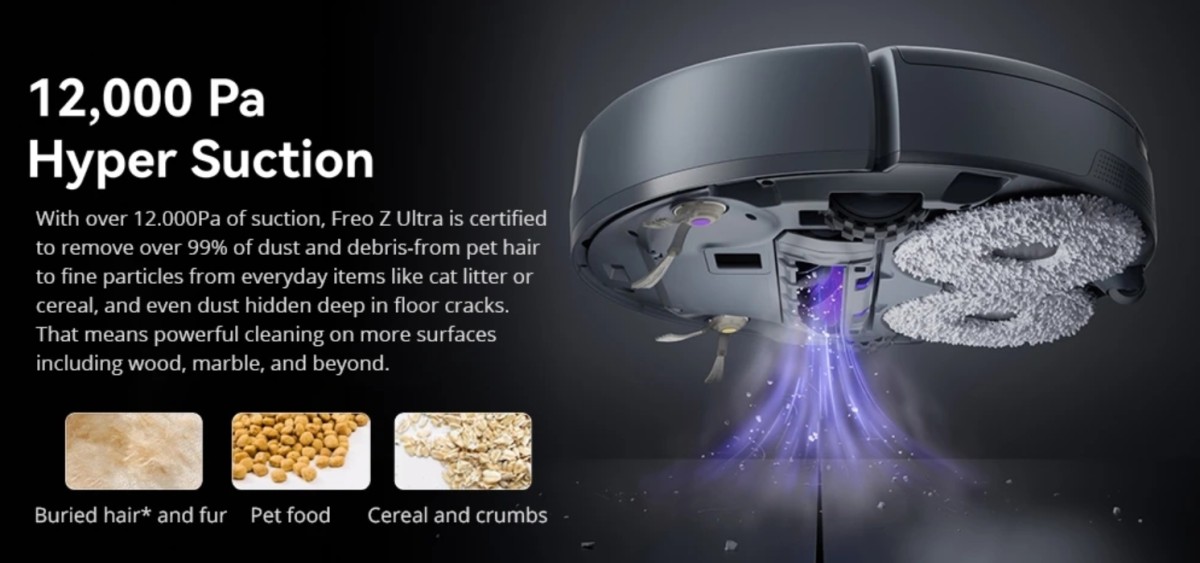 Robotporszívóról van szó, tehát a porszívózás teljesen önállóan zajlik, ez alap. Ami viszont nem hétköznapi, az a brutális, 12 000 Pa szívóerő. Ez egy kiemelkedően magas érték, nagyjából háromszorosa annak, amit sok hagyományos porszívó produkál.