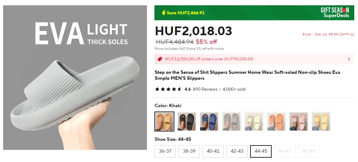 Kár, hogy a reklámozott papucs csak u.n. “első vásárló” kedvezménnyel vehető az írt árért. Az AliExpress-nél nem első vásárlóként a papucs ára