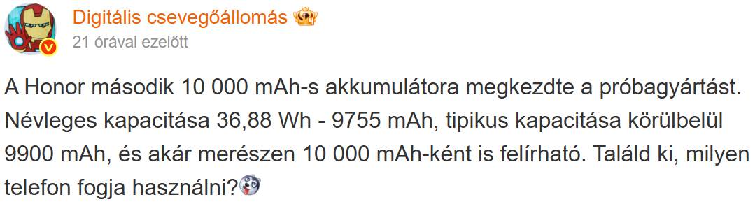 Mindkettő próbagyártásba került, és hamarosan megjelenhet az új Honor modellekben. Bár a forrás nem árulta el, pontosan melyik készülék kapja meg ezeket, a korábbi információk alapján a 10000 mAh-s cella a Honor Power 2-ben debütálhat.