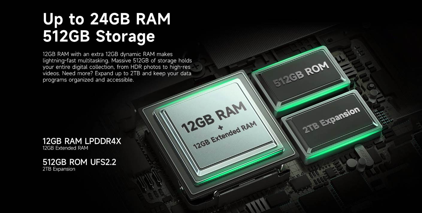 Az Armor 33-at a MediaTek Helio G100 működteti és 12 GB RAM bőven elég, ahogy az 512 GB UFS 2.2 tárhely is (ami akár 2TB-tal is bővíthető).