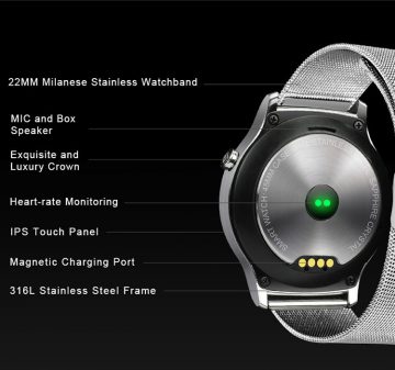 Egy rendkívül igényes okosóráról van szó, cserélhető krokodil bőr vagy fém szíjjal. A rozsdamentes acél és tökéletesre csiszolt óraház mentes minden felesleges sallangtól és fekete, ezüst, arany színekkel érhető el, a szíj pedig kétféle anyaggal és több színnel. Mérsékelten vízálló, így kis mennyiségű víz nem árthat neki.