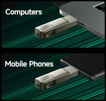Fém pendrive normál USB és Type-C csatlakozóval hogy mindennel gond nélkül használható legyen, beleértve a számítógépeket, laptopokat, telefonokat.