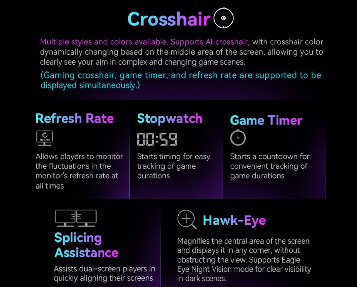 Célkereszt: Többféle stílusban és színben elérhető. Támogatja az AI célkeresztet, amelynek színe dinamikusan változik a képernyő középső területének alapján, így összetett és változó játékkörnyezetben is jól látható marad a célpont. (A játék célkereszt, a játékidőzítő és a frissítési ráta egyszerre is megjeleníthető.)