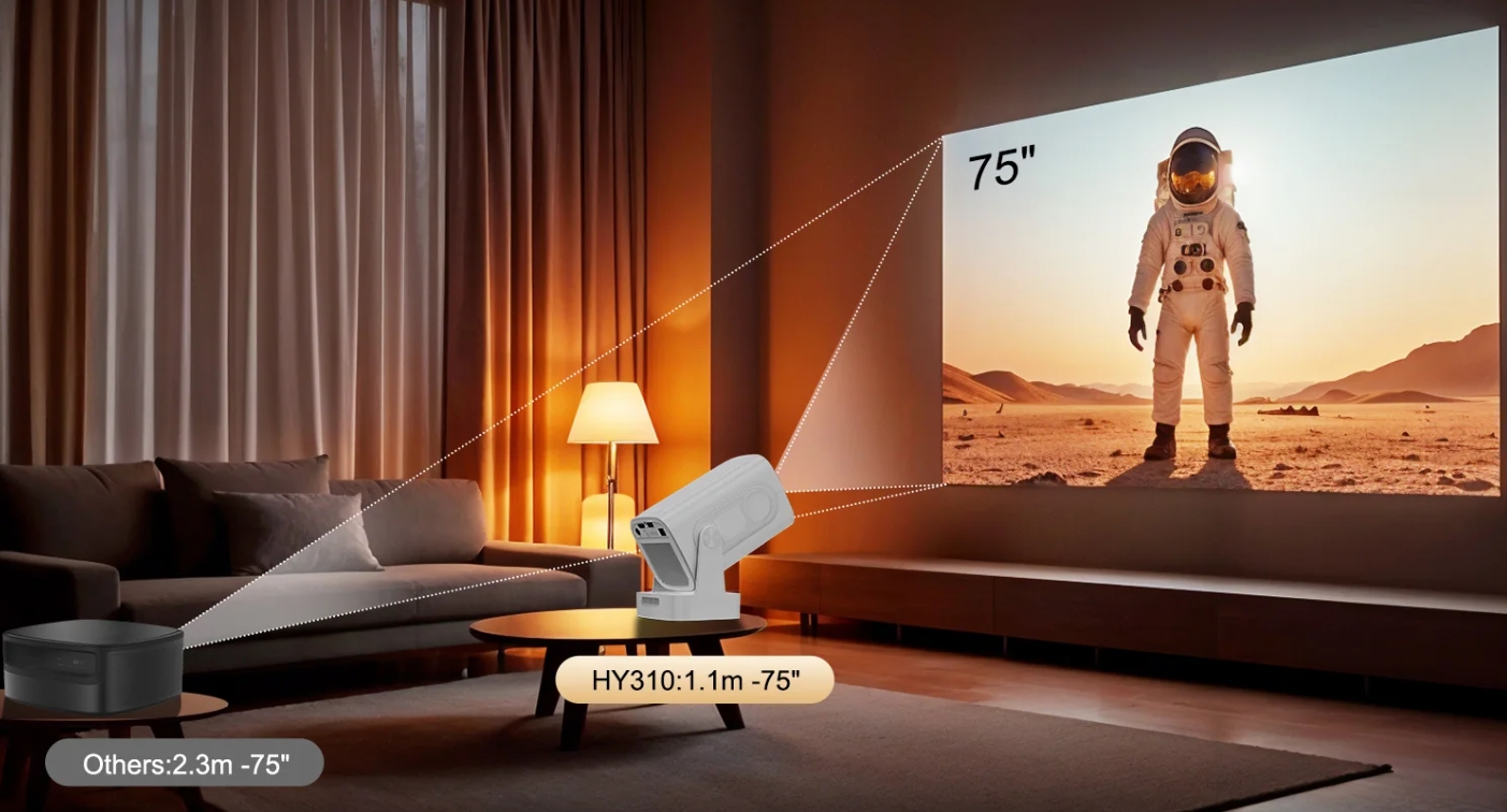 Simán képes 3-4 méteres képet is vetíteni és már 1.1 méterről is 75″ méretű képet ad és így nem kell nagyon nagy szoba egy nagy képhez.