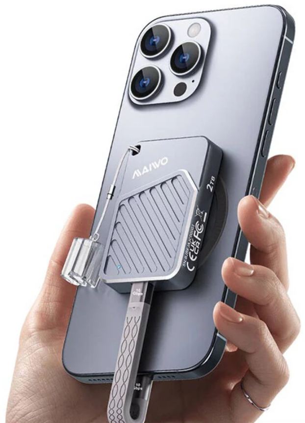 A MAIWO M3 több szempontból is izgalmas SSD meghajtó, mert nagyon nagy, 2000MB/mp sebességre képes és nem csak hogy összeköthető telefonokkal, de azokra mágnessel is rögzíthető. Ez azért jó, mert így egyetlen eszközt képez vele, nem csak úgy ott lóg.