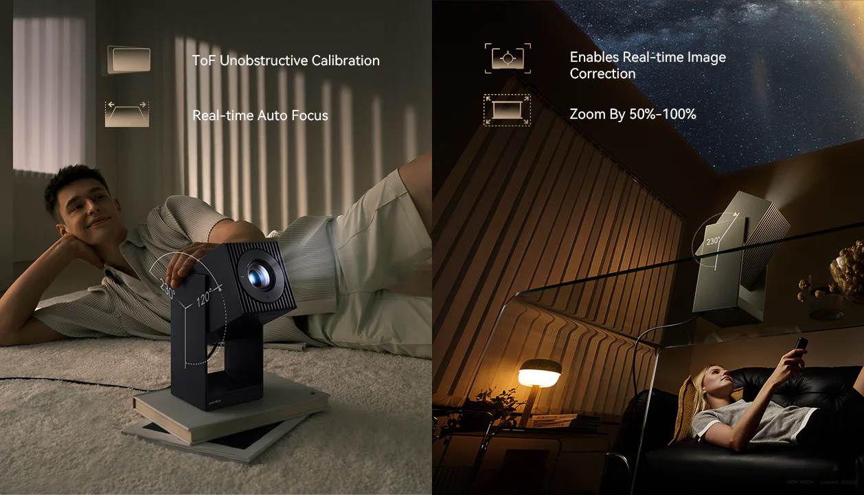 Ha nem szemből vetítesz vele, akkor eltorzulna a kép, de ezt villámgyorsan javítja és beállítja a fókuszt is automatikusan, hogy ne legyen homályos a kép. Akár oldalról is lehet vetíteni vele gond nélkül.