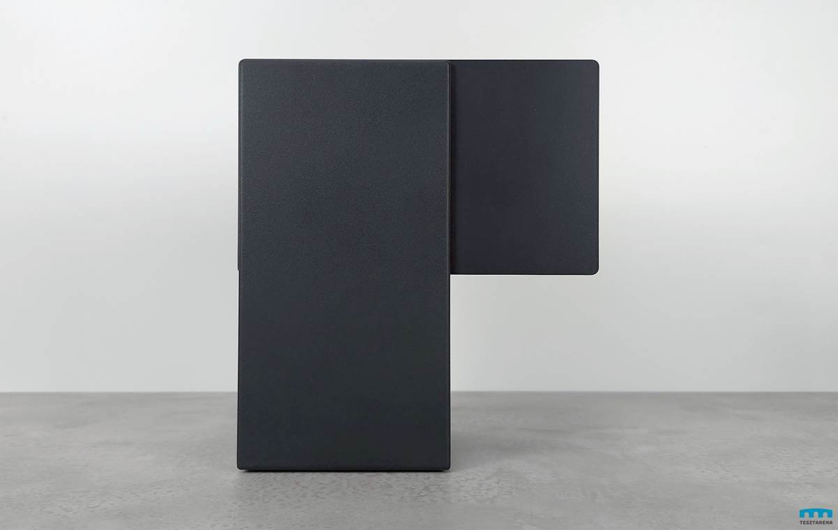 Tesztre a sötét színűt kértük, ami a szürke és a kék keveréke. Ha nincs használatban, akkor elfordítható annyira, hogy csak egy hasáb lesz belőle, alul a vetítő résszel, ami így védve is van.