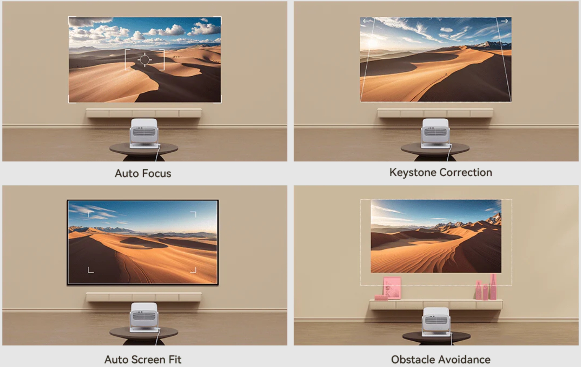 - van automatikus fókusz beállítás és trapéz korrekció, akadály elkerülés, vászonhoz igazítás funkció