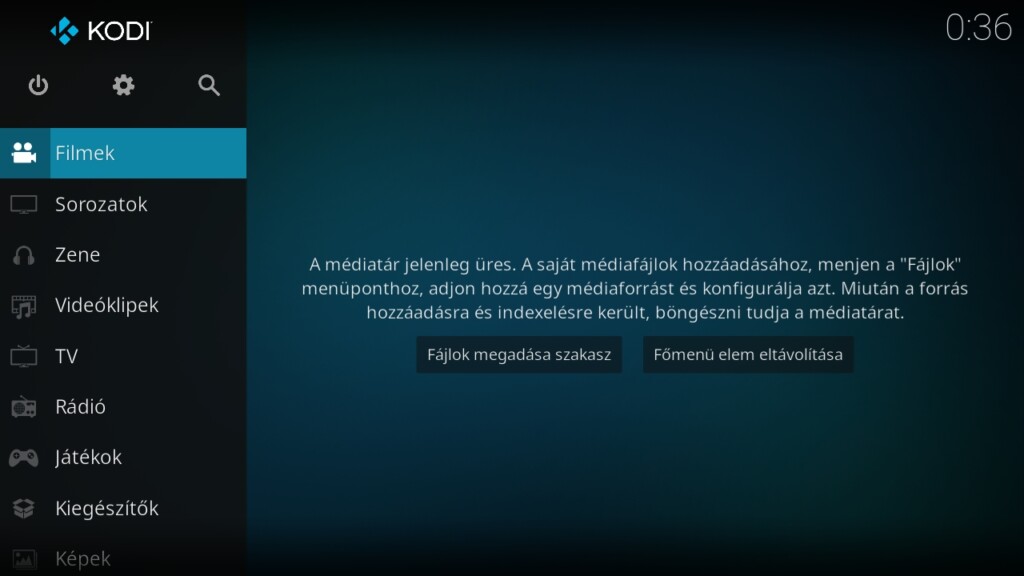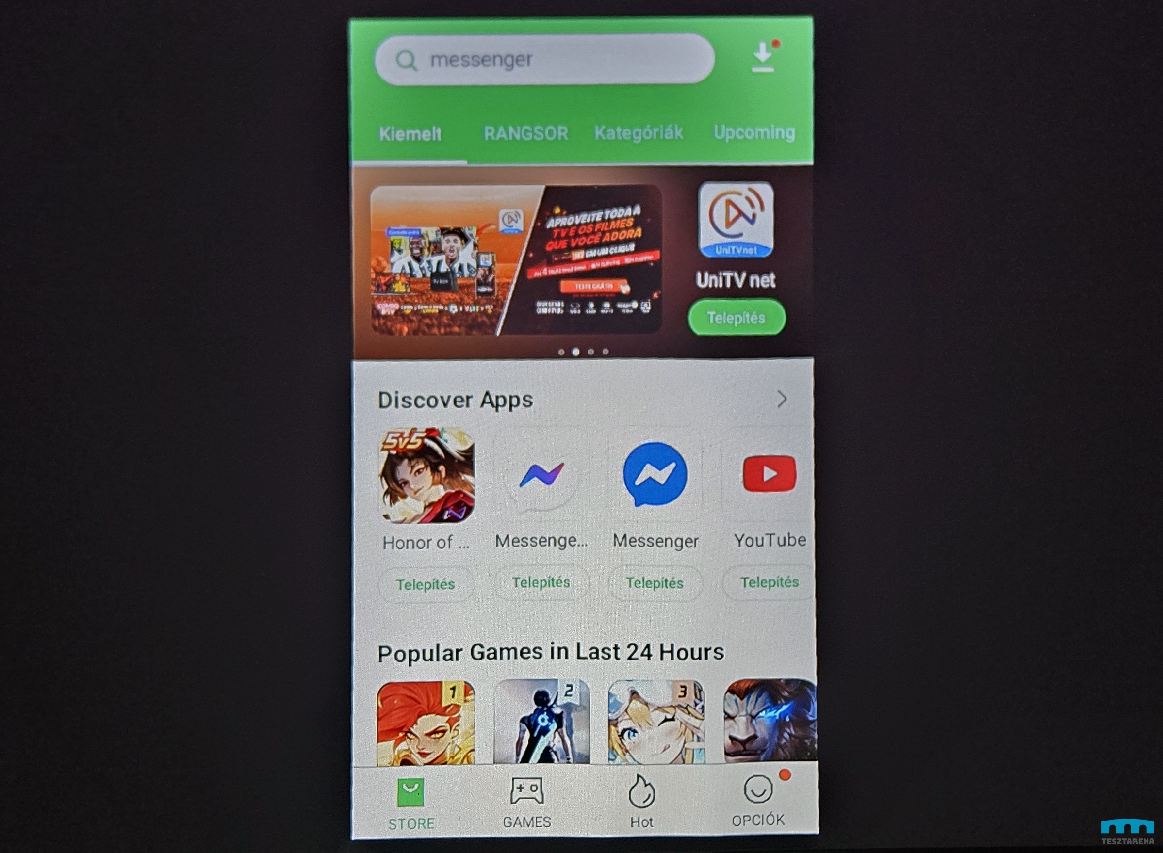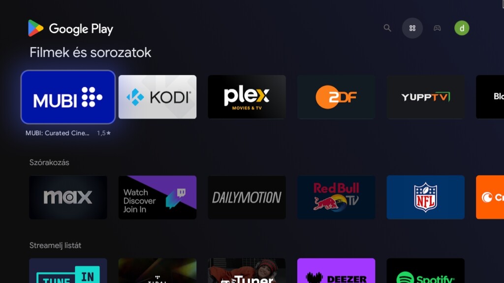 Android TV fut rajta Android TV alkalmazás bolttal és magyar nyelv is van (helyenként fura fordítással).