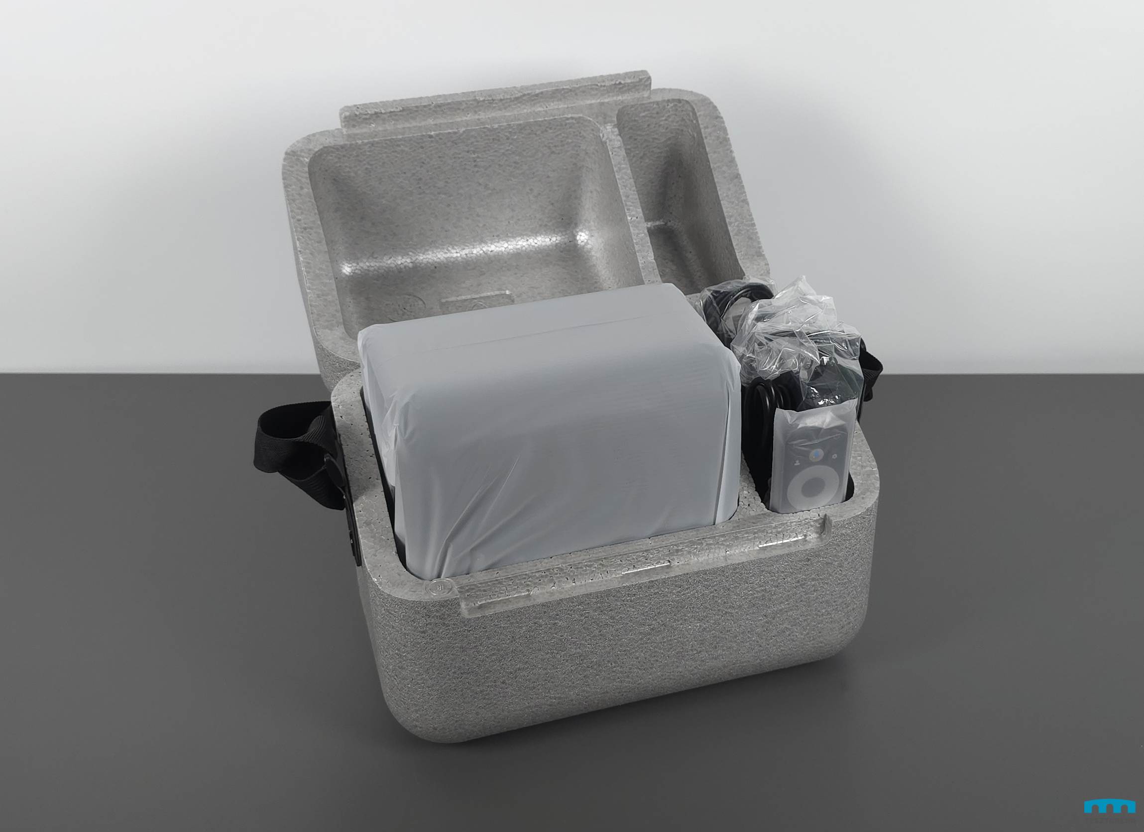 Jár hozzá egy olyan táska, ami valamilyen keményebb polisztirol habból készült, így védve a projektort (lehetne valamivel komolyabb is, de a semminél így is sokkal jobb).