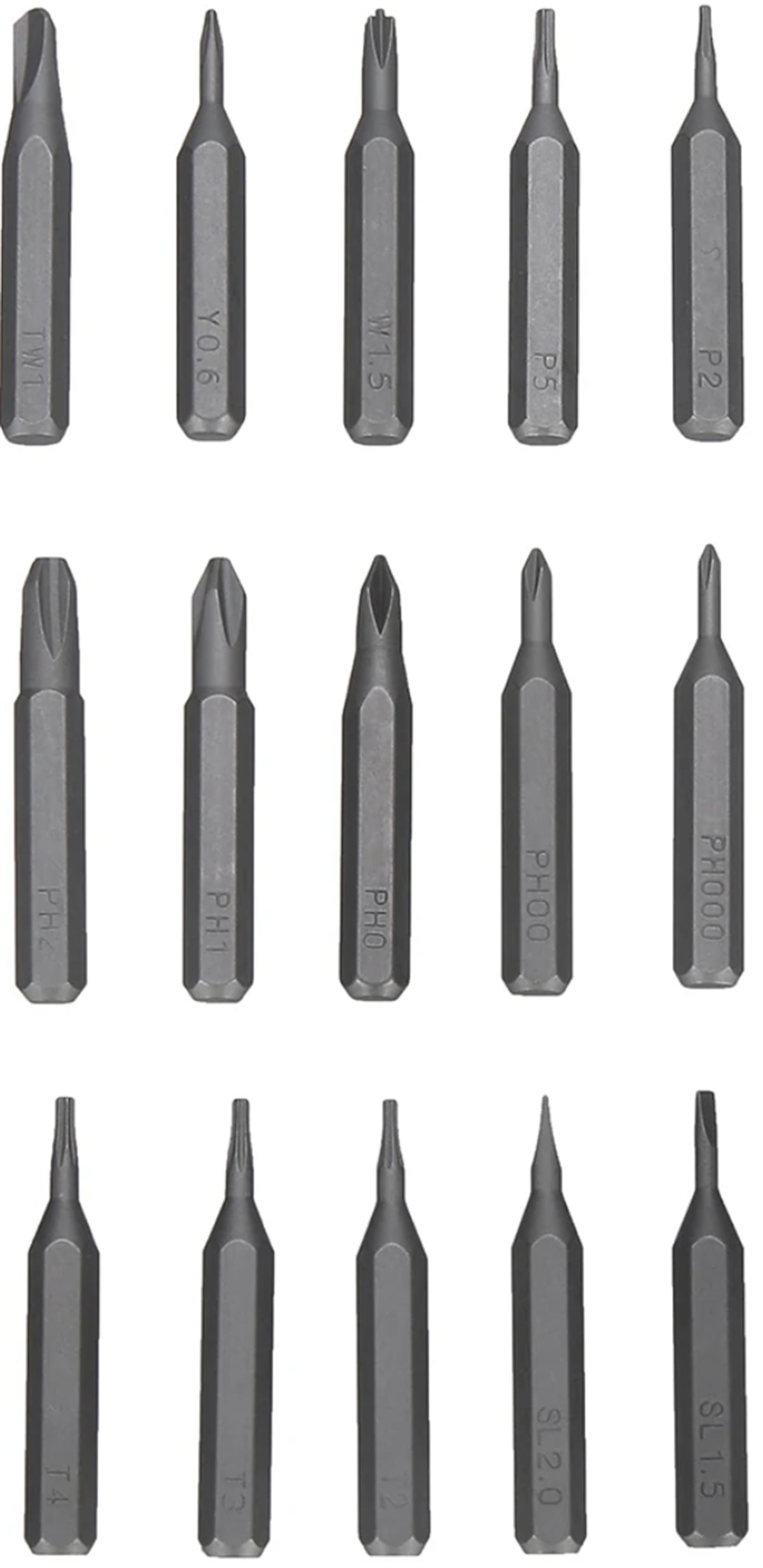 Van benne hagyományos keresztfej több méretben PH000, PH00, PH0, PH1 és PH2, ami jó apró elektronikához és nagyobb csavarokhoz is.