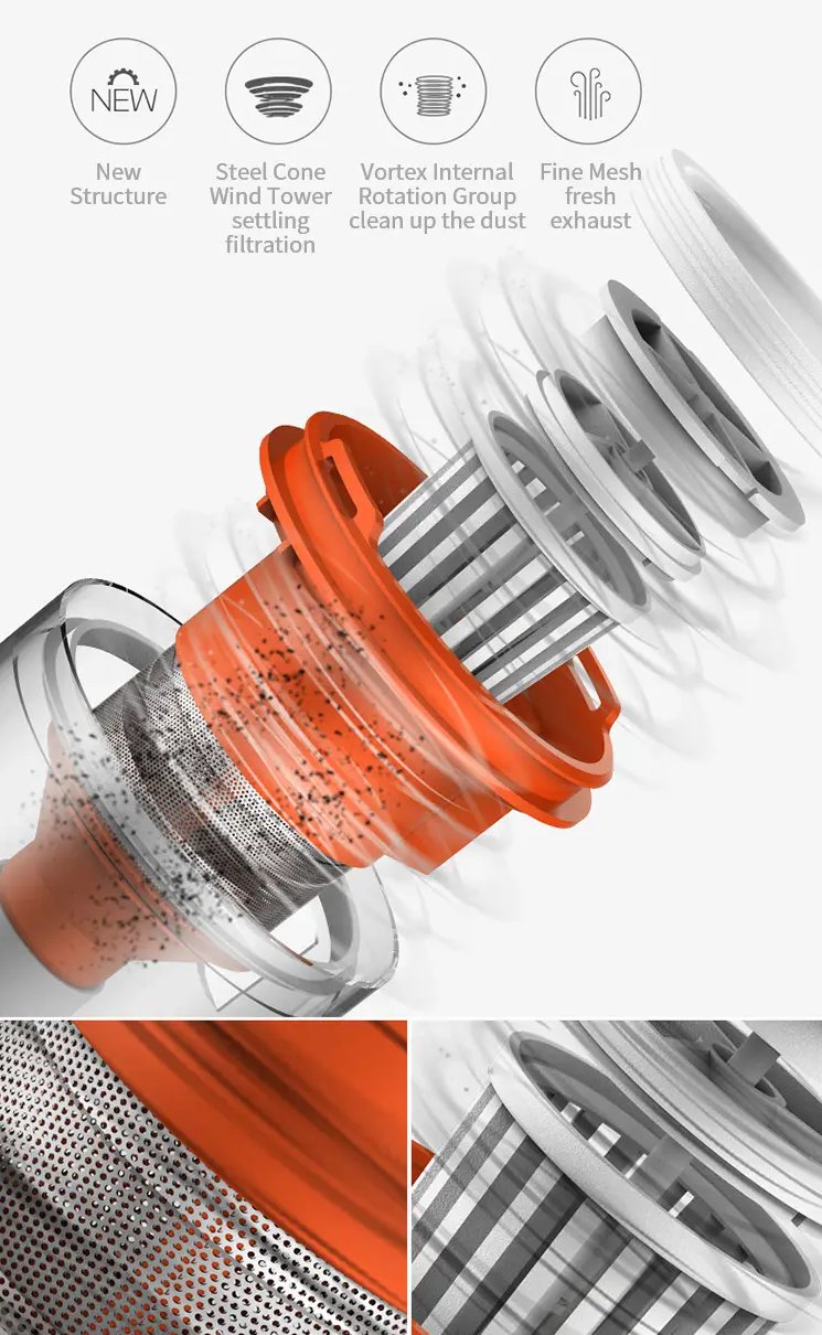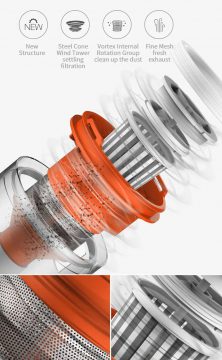 Van egy fém szűrő és egy másik (HEPA?) szűrő is. A fém szűrőn majdnem minden fennakad, de van ami továbbjut a második szűrőhöz, amit időnként takarítani kell. A kialakítása által küzdeni kell vele azért, de megoldható (odaütve valamihez viszonylag könnyen megoldható, de nem a legszerencsésebb a kialakítása valóban).