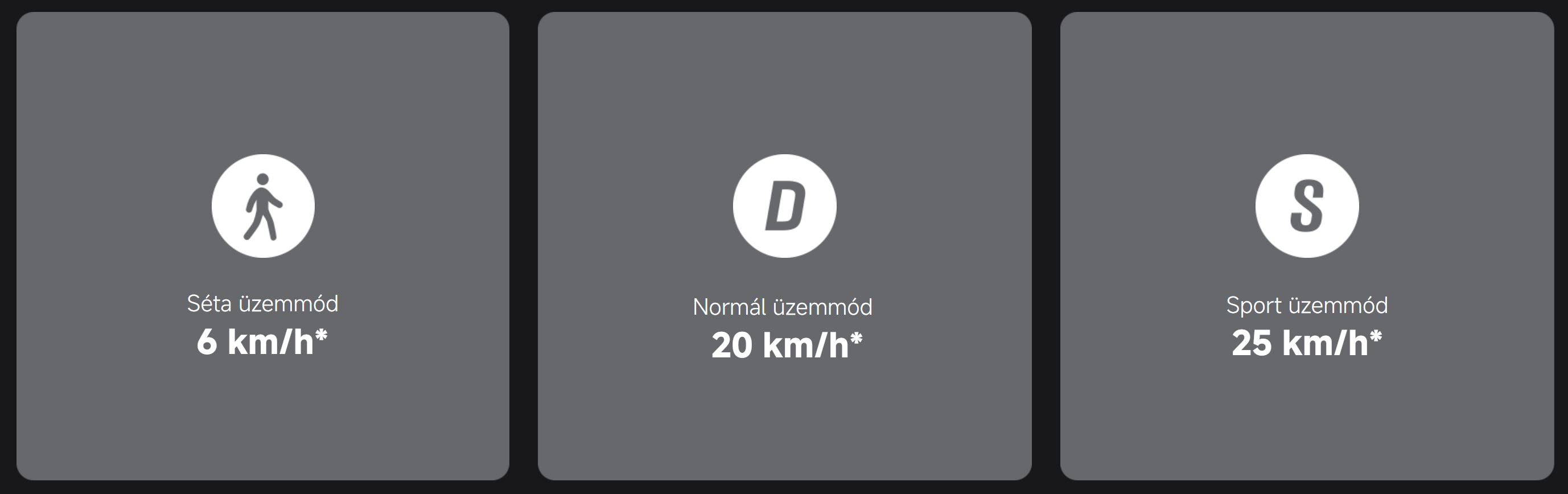 A végsebesség 25 km/h, amely a magyarországi jogszabályokkal is összeegyeztethető, de ezt kényelmesen lehet tartani nagyobb távolságokon is.