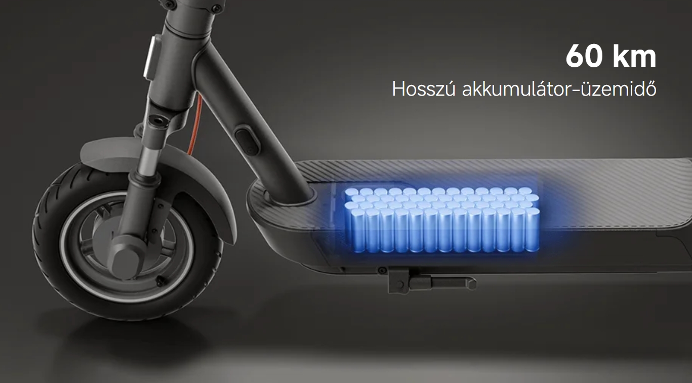 A városi rollerhasználók egyik legfontosabb kérdése mindig a hatótáv. Az új modell itt szintet lép: a 10.2 Ah-s lítium-ion akkumulátor akár 60 kilométeres távolságot is lehetővé tesz egyetlen feltöltéssel. Ez az érték természetesen függ a terepviszonyoktól, a felhasználó súlyától és a haladási tempótól, de átlagos városi körülmények között is bőven elegendő egy teljes munkanapra, sőt, akár hétvégi kiruccanásokhoz is.